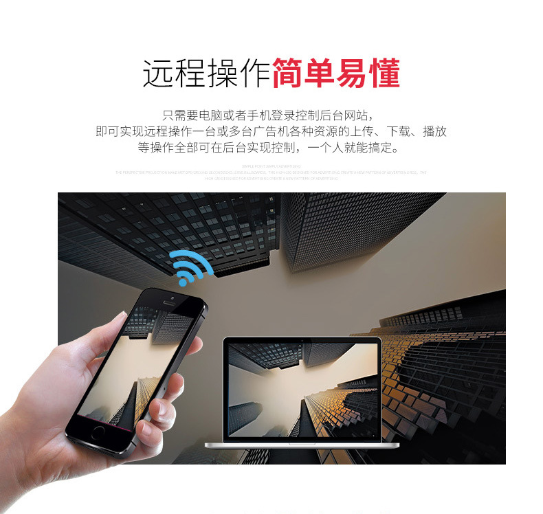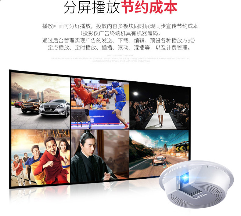 网络微型投影机广告终端机具有机号编码,通过后台管理实现广告的发送、下载、编辑、预设各种播放方式(定点播放、定时播放、插播、滚动、混播等),以及计费管理。