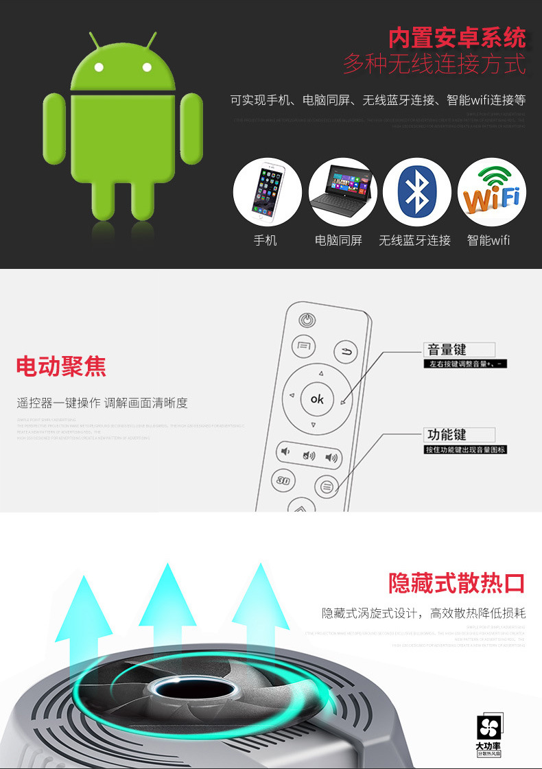 网络微型投影机终端机内置系统,连接互联网,实现手机、电脑、平板,且多点、多地、远距离上传广告。