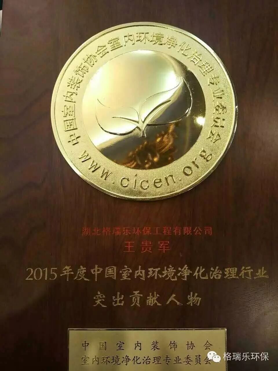 会议上,中国室内环境净化治理专业委员会还就2015年各企业的工作成就与贡献颁发了2015年度中国室内环境净化治理行业突出贡献奖,湖北格瑞乐环保工程有限公司获此殊荣!