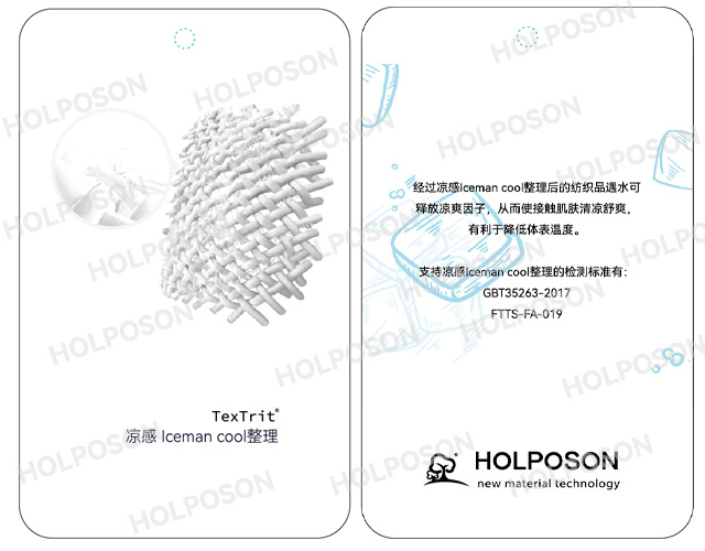 HOL机ON®ICEMAN COOL也叫酷冰侠®是一款专门针对纺织品开发的凉感功能整理剂,是由我公司的东华大学博士团队开发的以木糖醇,赤糖醇,丝蛋白为主的接触吸湿凉感整理剂。适合用于天丝,冰丝,棉,涤纶等各种纤维的后整理。其作用原理:凉感整理剂HOL机ON® ICEMAN COOL处理在面料表面的木糖醇遇水发生吸热反应,释放凉爽因子从而使接触到凉爽因子的皮肤清凉舒爽,另外其所含有的丝蛋白成分具有良好的保湿功能,清凉保湿双组合使得人们在炎炎的夏日有降温防护的可能。