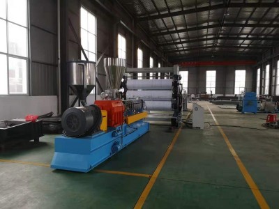 EVA防水板材,EVA防水板材生产设备(规格)生产工艺:高混机——上料机——喂料机——单(双)螺杆挤出机——液压自动换网装置——片材挤出模具----三辊压光机-----托架冷却------输送带------在线切割装置-----在线收卷