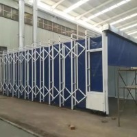 工作原理:移动伸缩前室由钢架结构和阻燃PVC布组成,通过平行四边形连杆机构或轨道驱动系统实现自动展开与合拢。工作时,前室沿轨道平滑移动至工件上方,形成封闭/半封闭空间进行喷漆;完成后收缩至一侧,节省空间并实现多工序共用场地。其核心系统包括: